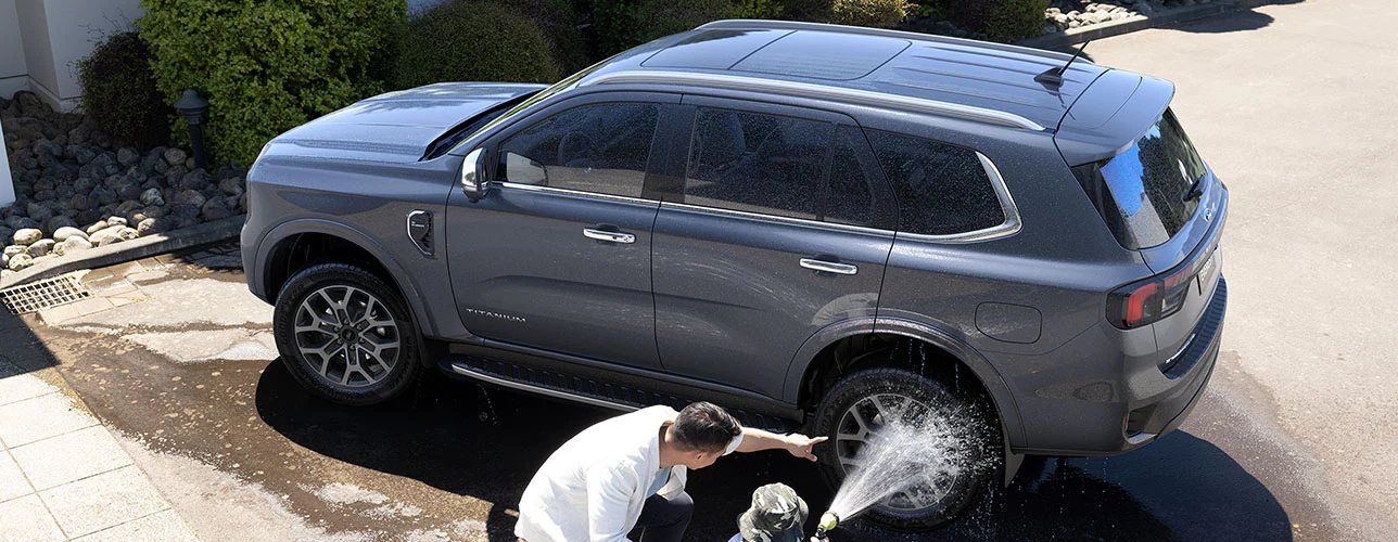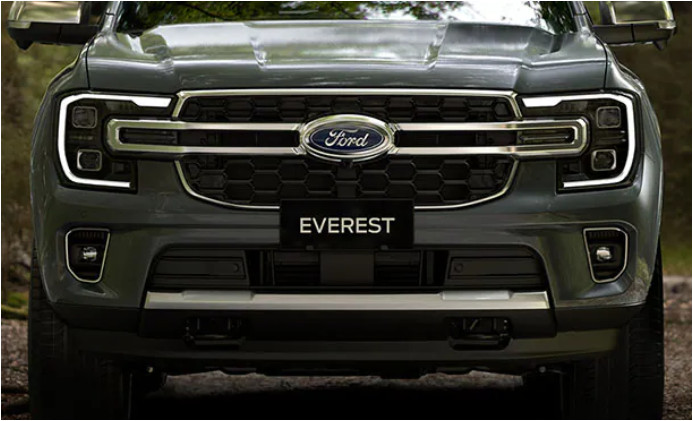 Phần đầu xe Everest Titanium+ đặc biệt nổi bật với lưới tản nhiệt dạng lưới mạ crôm kết hợp cùng cụm đèn LED hình chữ C mang đậm đặc trưng thiết kế toàn cầu của Ford. Các điểm nhấn mạ crôm trên gương, tay nắm cửa, bậc lên xuống hai bên xe tạo nên vẻ cứng cáp nhưng vẫn vô cùng sang trọng cho chiếc xe.