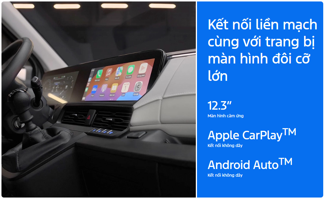 Lần đầu tiên, Ford Transit Hoàn Toàn Mới được trang bị màn hình đôi cỡ lớn, hỗ trợ kết nối Apple CarPlay® ¹ và Android Auto™ ¹ không dây, hỗ trợ bản đồ dẫn đường, kết nối điện thoại, giải trí cùng nhiều tính năng khác.