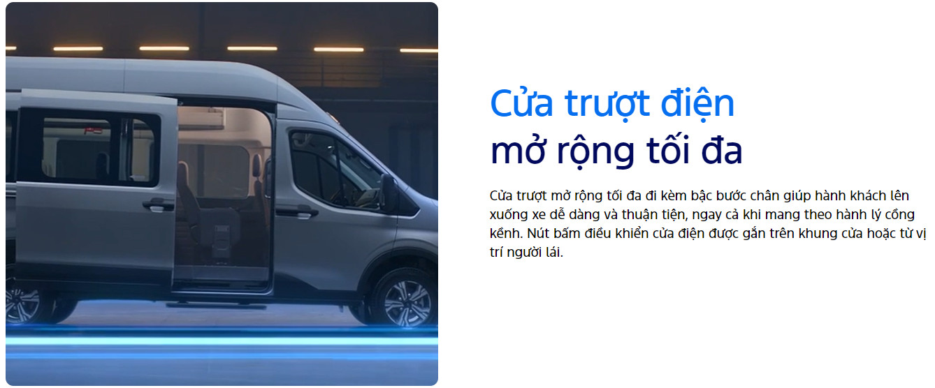Cửa trượt được thiết kế để tối đa khoảng không gian khi mở, giúp hành khách lên xuống xe dễ dàng, ngay cả khi mang theo hành lý cồng kềnh. Tích hợp nút bấm điện từ tại vị trí người lái và khoang hành khách nhằm tăng sự thuận tiện khi sử dụng.