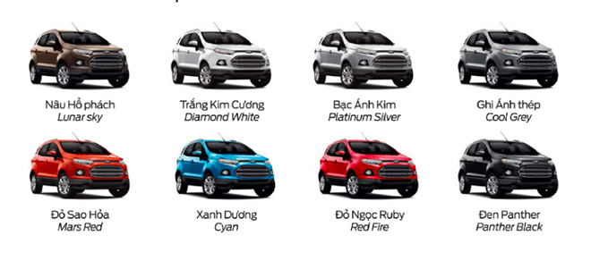 Các màu sơn ngoại thất của Ford EcoSport 2021 gồm (8 màu): Xanh dương, Đỏ đồng, Trắng kim cương, Bạc ánh kim, Nâu hổ phách, Đỏ ngọc ruby, Đen, Ghi ánh thép.