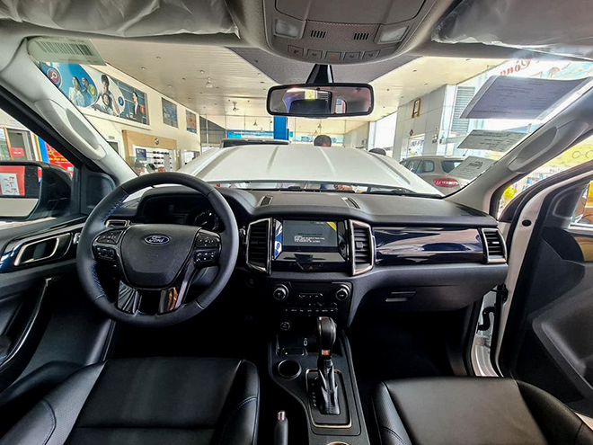 Bên trong khoang nội thất Ford Everest Sport, ghế và táp-lô bọc da với điểm nhấn là các đường chỉ thêu màu xanh dương, phong cách tương đồng với mẫu bán Ranger Raptor. Ngoài ra, hàng ghế phía trước cũng có thêm chữ “Sport” được dập ở phần tựa lưng.