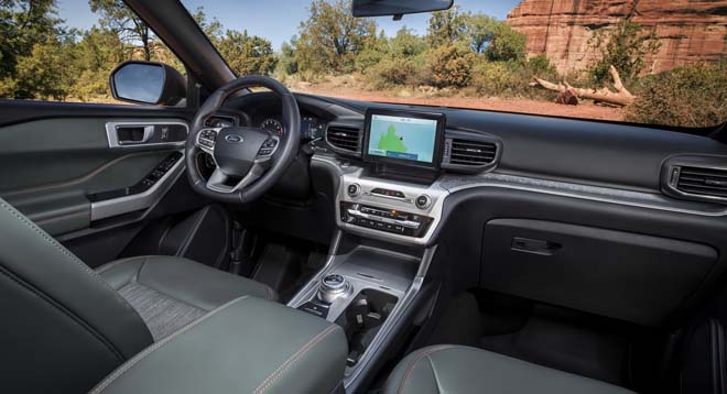 Nội thất bên trong khoang cabin của Ford Explorer Timberline 2021 có tông màu xanh thẫm (Deep Cypress) phối với trần xe màu đen, kết hợp với cụm điều khiển, tay nắm cửa dạng lan can, các tấm chắn nắng. Ghế ngồi được bọc vải ActiveX một phần với các đường chỉ may màu cam nổi bật, bệ tỳ tay và ốp cửa tạo sự thống nhất về thiết kế, lót sàn bằng thảm cao su.