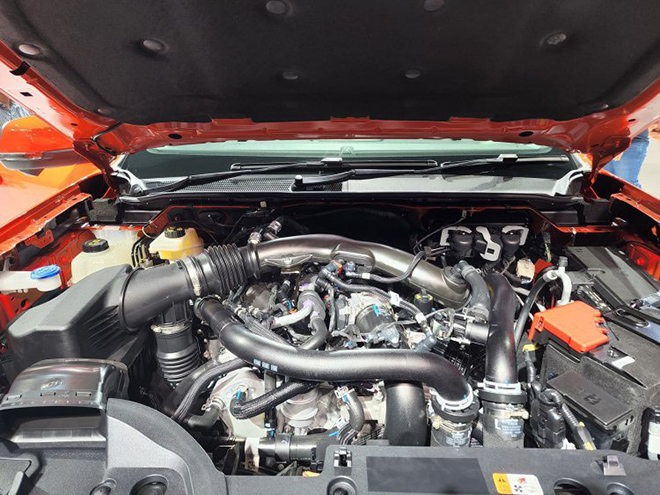 Ford Ranger Raptor 2022 phiên bản máy xăng V6, dung tích 3.0L tăng áp kép công nghệ EcoBoost, cho công suất tối đa 397 mã lực và mô-men xoắn cực đại 583 Nm, xe sử dụng hệ dẫn động 4 bánh toàn thời gian 4WD và hộp số tự động 10 cấp (10AT), đi cùng với 7 chế độ lái khác nhau.