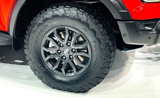 Ford Ranger Raptor sở hữu thiết kế đẹp mắt, hầm hố lấy cảm hứng từ mẫu bán tải hiệu năng cao cỡ lớn F-150 Raptor với đèn pha LED tạo hình chữ “C” và lưới tản nhiệt cỡ lớn với dòng chữ “FORD” làm điểm nhấn nổi bật. Nắp ca-pô được dập nổi với các đường gân guốc. Bốn hốc bánh được thiết kế theo phong cách body thân rộng đầy nam tính. Xe được trang bị bộ mâm 17 inch và lốp AT giúp tăng khoảng sáng gầm xe.