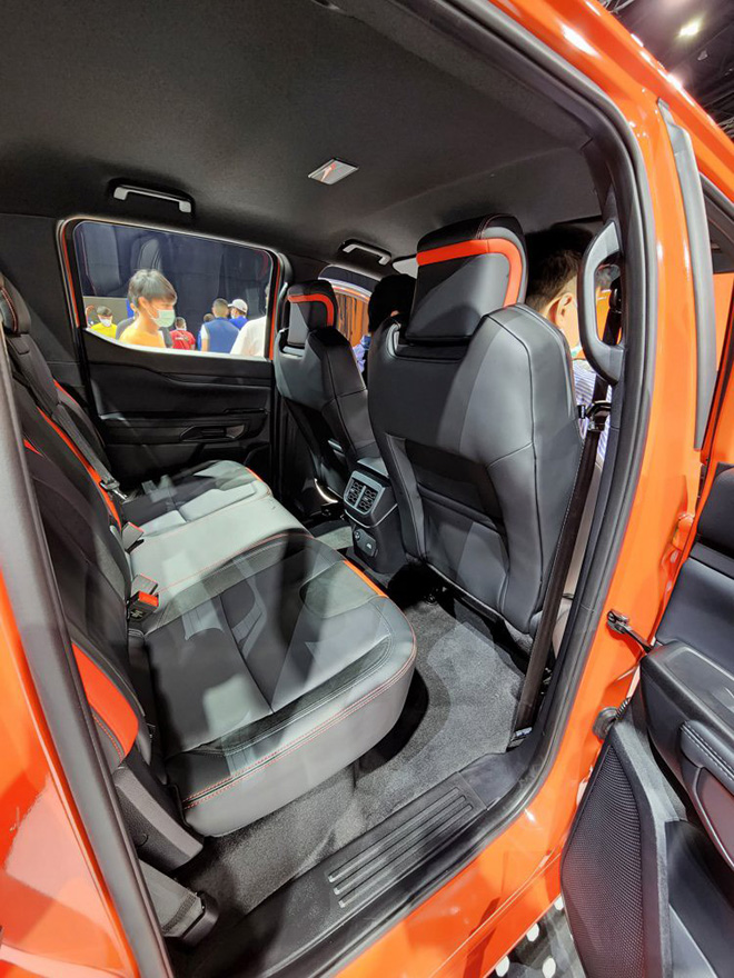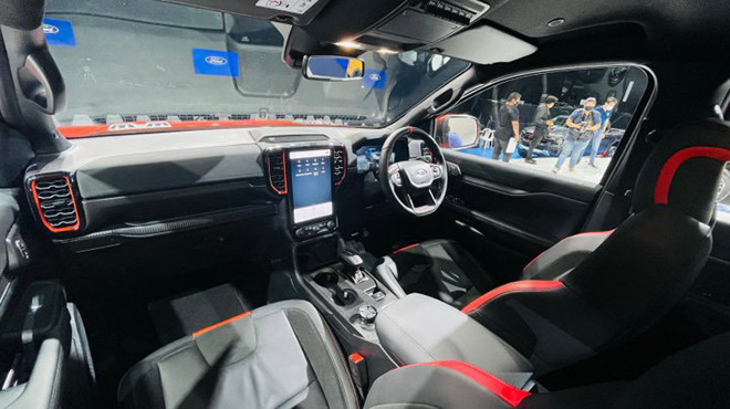 Ranger Raptor sở hữu cabin thiết kế hiện đại, hãng xe Mỹ chú trọng vào những trang trí thể thao với các chi tiết viền và chỉ khâu màu đỏ, ghế ngồi bọc da pha da lộn, logo Raptor. Vô lăng thiết kế đẹp mắt hơn với dấu “12h” nổi bật, tích hợp lẫy chuyển số và sưởi. Xe được trang bị tiêu chuẩn cụm đồng hồ kỹ thuật số 12,4 inch, màn hình cảm ứng trung tâm 12 inch cực lớn với thông tin giải trí SYNC 4 của Ford và hệ thống âm thanh B&O 10 loa.