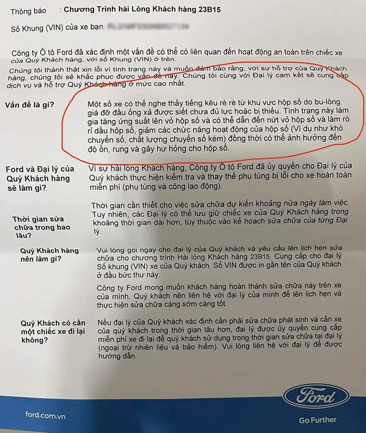 Cụ thể, Ford Việt Nam đã có thông báo Chương Trình Hài lòng Khách hàng có mã hiệu 23B15, liên quan đến giá đỡ đầu ống xả được bắt vào xe không đúng thiết kế kỹ thuật trên một số xe Ford Ranger thế hệ mới lắp ráp tại Việt Nam.