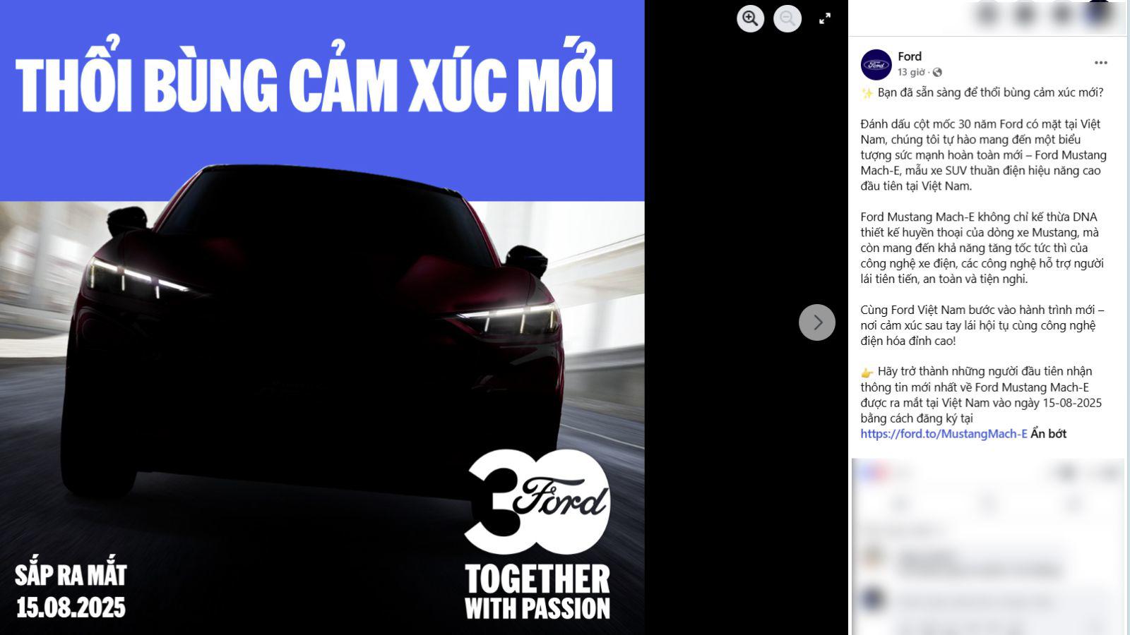 Trên fanpage chính thức của Ford Việt Nam, mẫu xe điện Mustang Mach-E đã xuất hiện và chốt ngày 15/8 để ra mắt