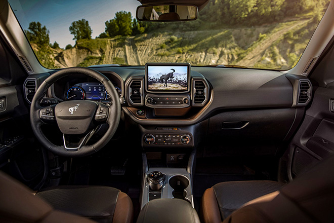 Nội thất Bronco Sport đơn giản và dễ sử dụng. Chính giữa là màn hình thông tin giải trí SYNC 3 rộng 8 inch, tương thích Apple CarPlay™ và Android Auto™. Xung quanh là các phím điều khiển cơ, các khe gió dọc và núm điều khiển cần số. Xe cũng được cung cấp Ford+Alexa và radio vệ tinh SiriusXM™ . Hệ thống âm thanh B&O 10 loa. Khu hành lý Bronco Sport còn có thể lắp thành một chiếc bàn để phục vụ cho việc ăn uống. Khu này cũng có ổ sạc 400W và làm bằng chất liệu dễ dàng chùi rửa.