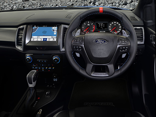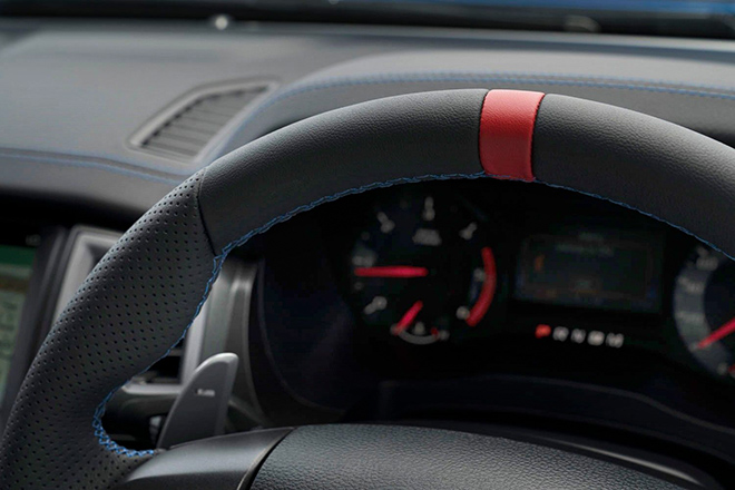 Mốc đánh dấu góc 12 giờ màu đỏ nổi bật trên vô lăng của Ranger Raptor không chỉ đơn thuần là một phần của thiết kế nội thất. Trên thực tế, chi tiết này có ý nghĩa quan trọng hơn rất nhiều. Chi tiết này có ý nghĩa về chức năng hơn là thiết kế, sọc đỏ đánh dấu vị trí 12 giờ hỗ trợ tài xế luôn có được sự tập trung khi phải điều khiển xe ở tốc độ cao.